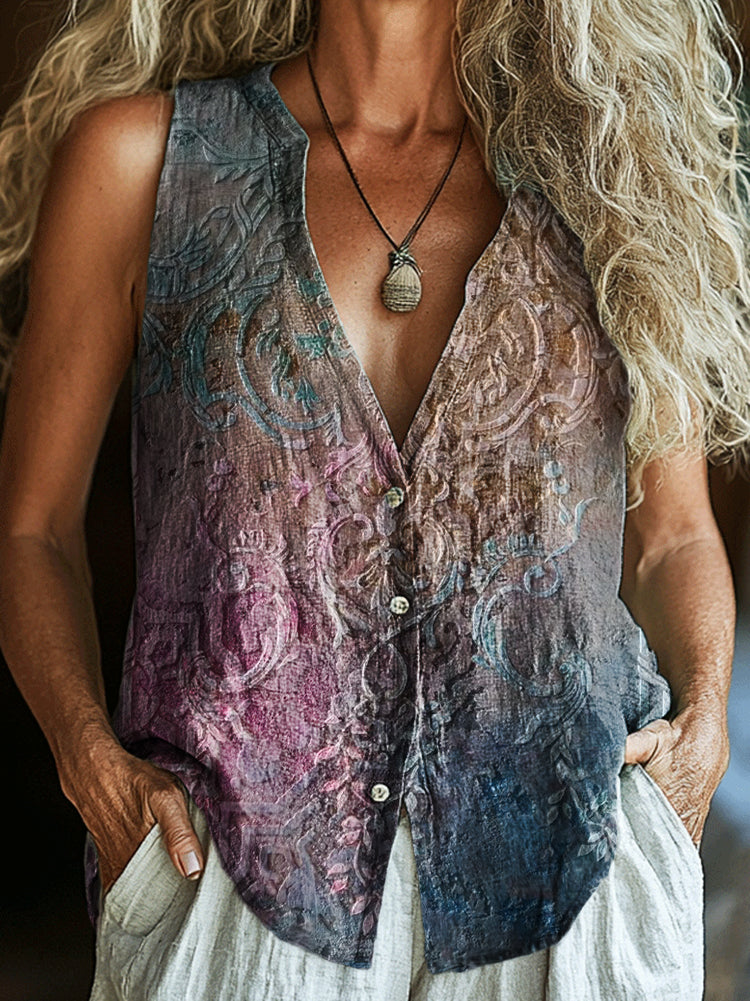 Women's Vintage Ethnic Floral Art Print Sleeveless Cotton Shirt