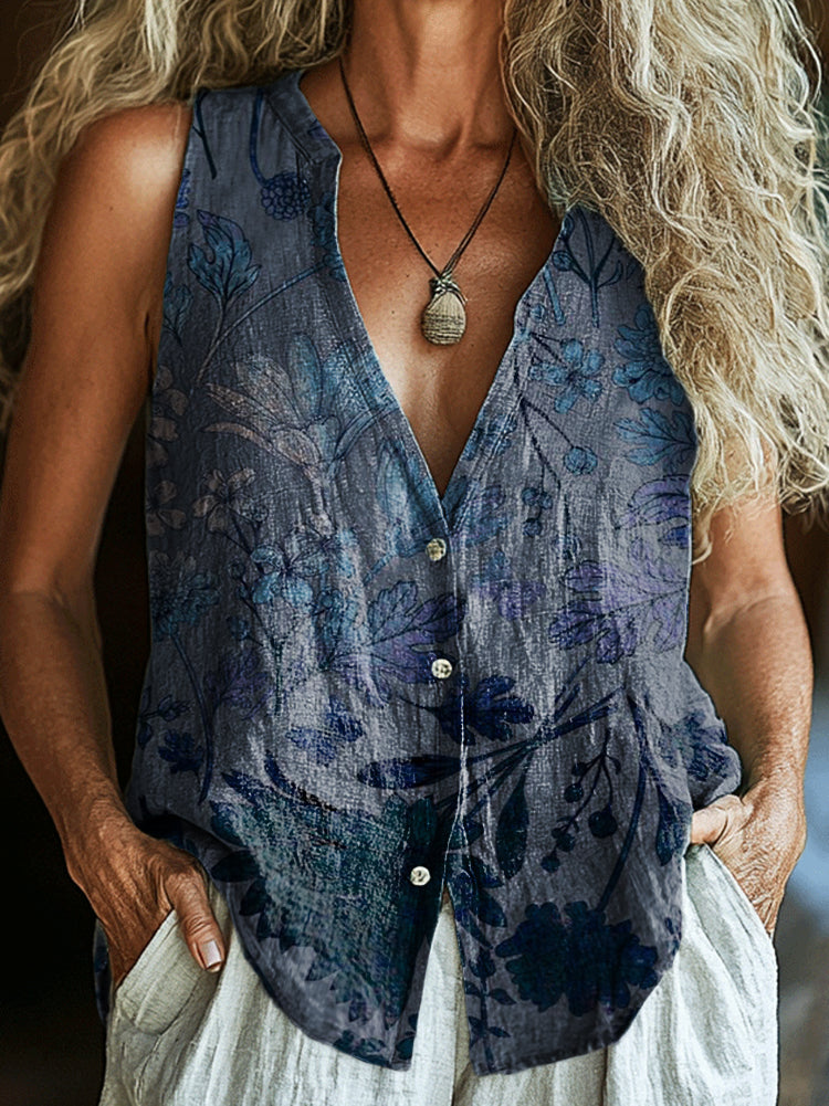 Women's Vintage Ethnic Floral Art Print Sleeveless Cotton Shirt